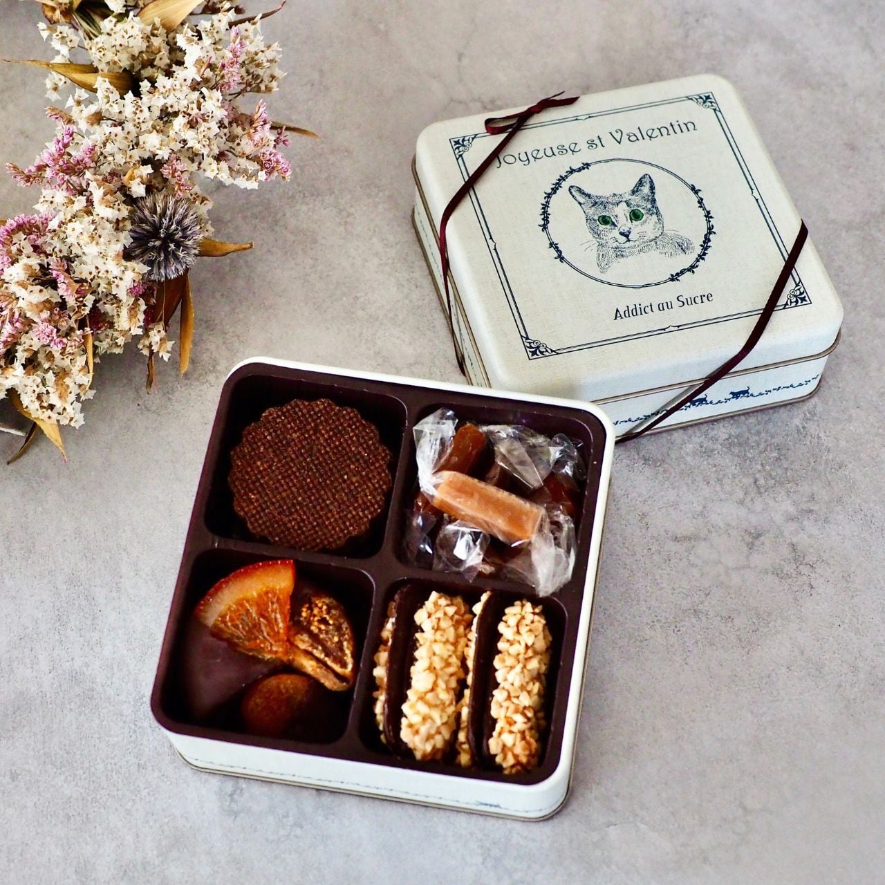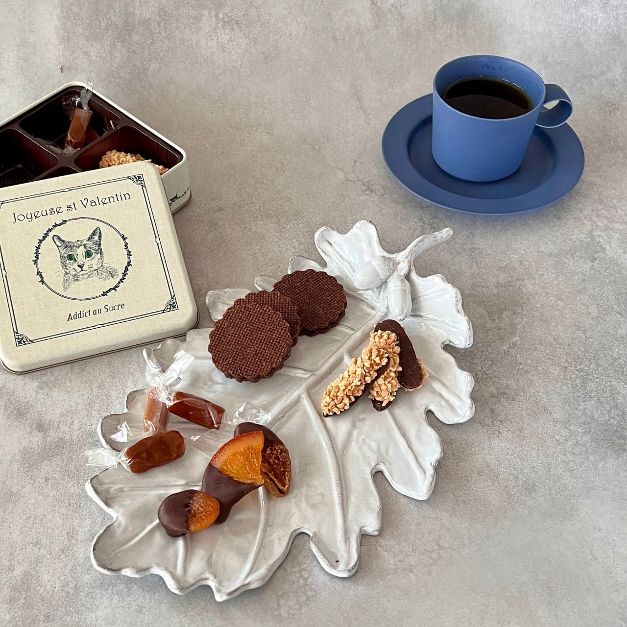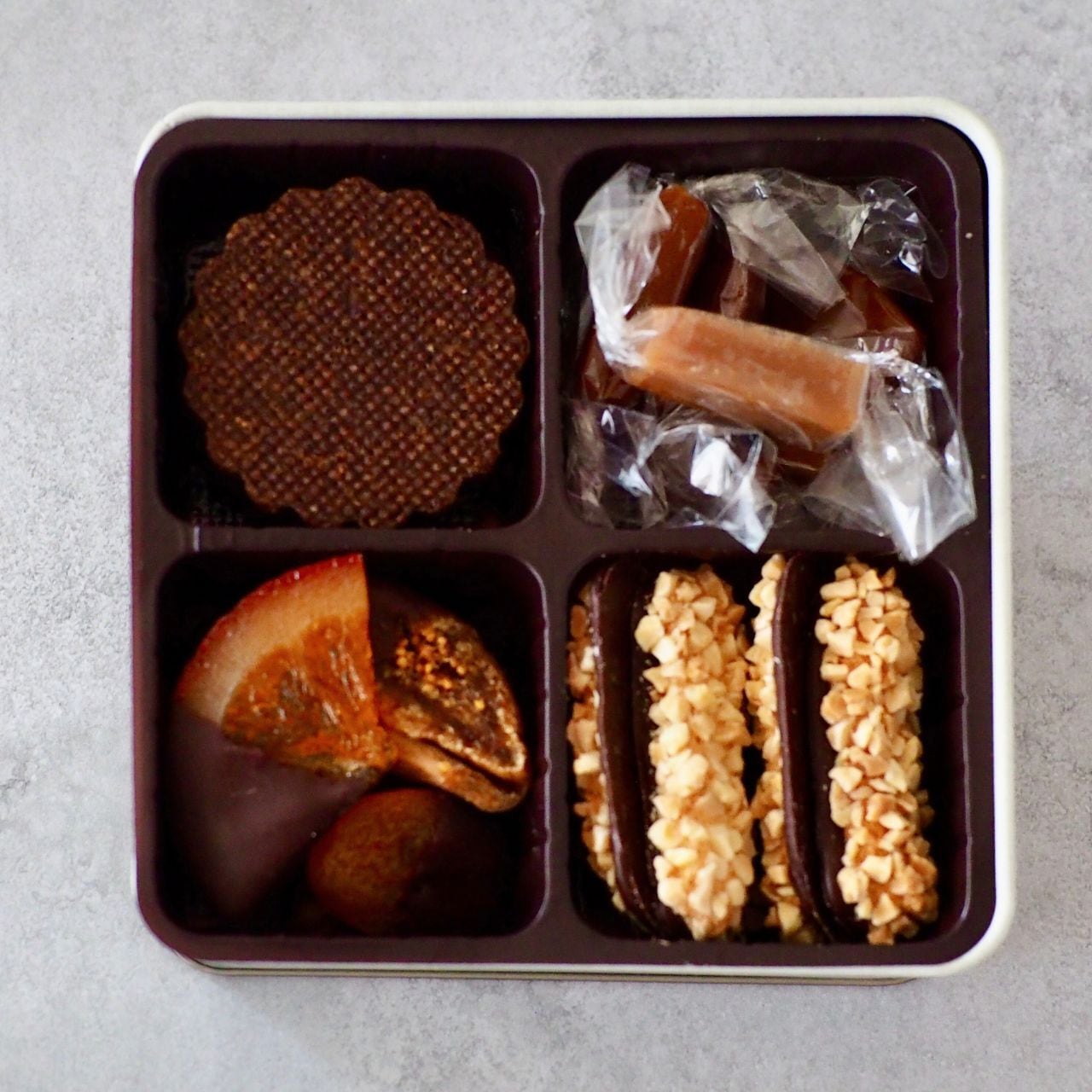 薄くサクサクとした食感のヘーゼルナッツ入りサブレショコラ、バニラとチョコレートのキャラメル、フルーツのチョコレートがけ、アーモンドとメレンゲ生地のバトンマレショ。